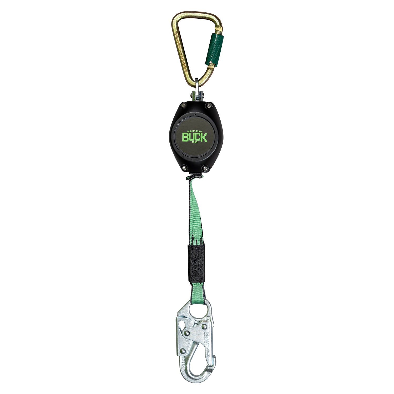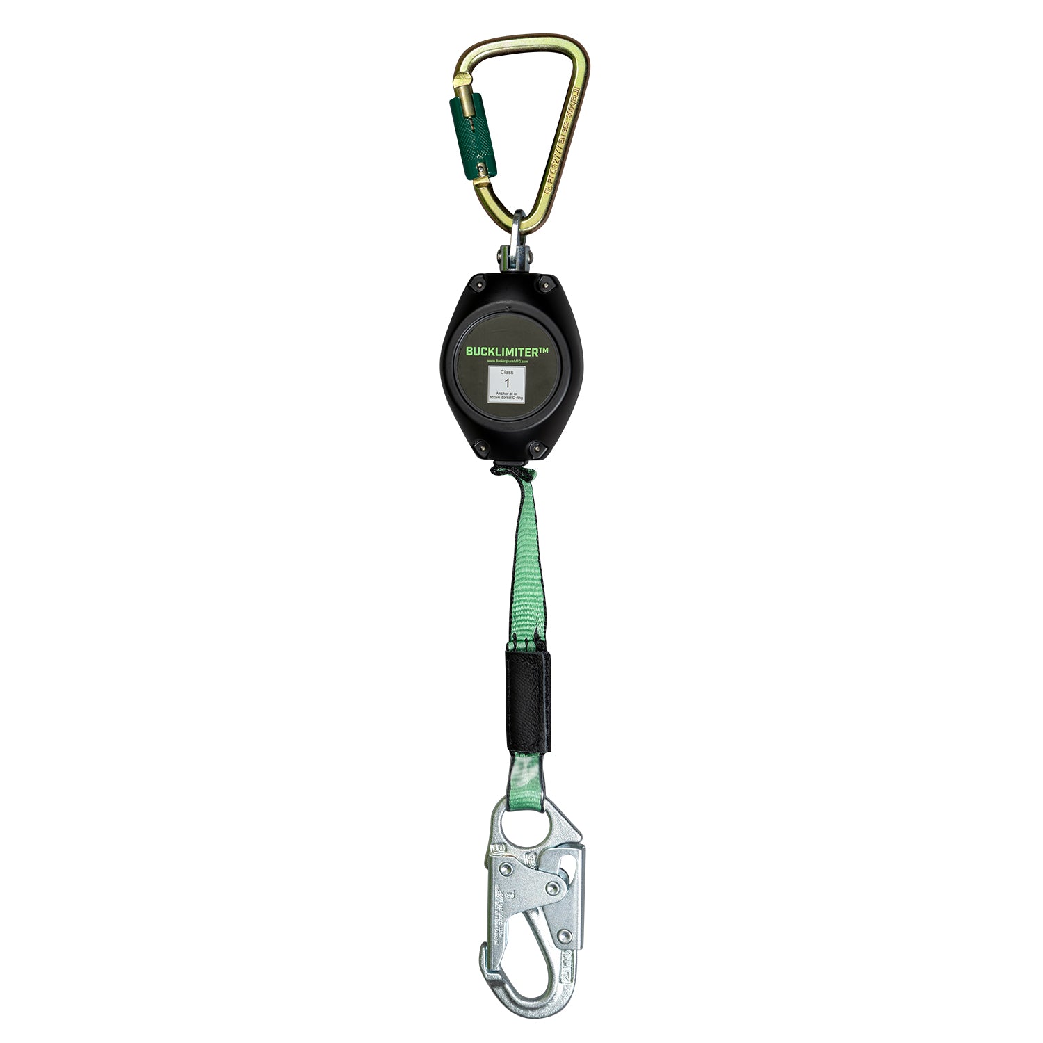 The BuckLimiter™ retractable features aluminum alloy construction inside and out while both the mechanism and housing is made of corrosion-resistant alloy. Features a braking system that is designed for smooth consistent operation to prevent “jerky” lock-ups. Accompanied with a 50051 steel carabiner with a 3600 lb gate and a 17061 snap with a 3600 lb gate load. A tangle-free swivel top adds to the mobility and a 7′ extension for an expanded work area. The BuckLimter™ has Dyneema polymer fiber 1″ webbing that is up to 15x stronger than steel. Resistant to moisture, abrasions, UV light, and chemicals. Weighs 1.9 lbs.