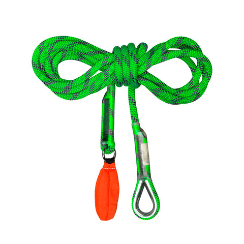 A 7/16" - 1/2" Semi Static Kernmantle 16 lifeline that features a stitched eye with steel thimble at one end. Tight eye with weighted bag on the other end.