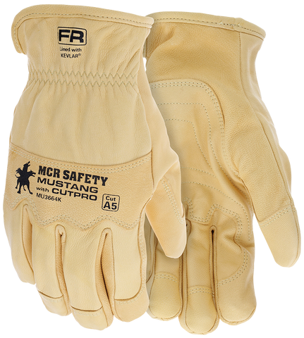 MCR Safety's Mustang Series offers premium quality utility work gloves that stand up to tough jobs! The MU3664K is made with top quality honey gold grain goatskin that provides strength and durability, yet remains soft and comfortable during hot and sweaty work conditions. Strategically positioned second layers of premium goatskin in the palm, fingertips, thumb crotch, index finger and knuckle provide additional protection without sacrificing dexterity. The MU3664K has a full Kevlar® lining and provides outstanding cut, abrasion, and puncture resistance. Other features include a shirred elastic cuff, comfortable wing style thumb, and an arc rating of 50 cal/cm². This CAT4 rated field glove will provide all day protection and comfort to get the job done. If you are looking for the best high dexterity leather work glove options, look no further than MCR Safety!